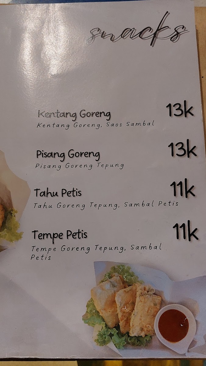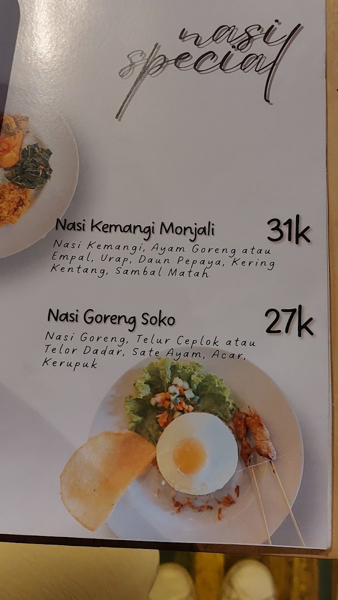 Highlights include the tender Nasi Empal served with aromatic herbs, and the crunchy Kering Kentang, all beautifully paired with Sambal Matah to elevate your dining experience at just IDR 31,000. For poultry lovers, the Nasi Ayam Goreng is a must-try, featuring crispy fried chicken complemented by fried egg and fresh pickles at IDR 27,000.